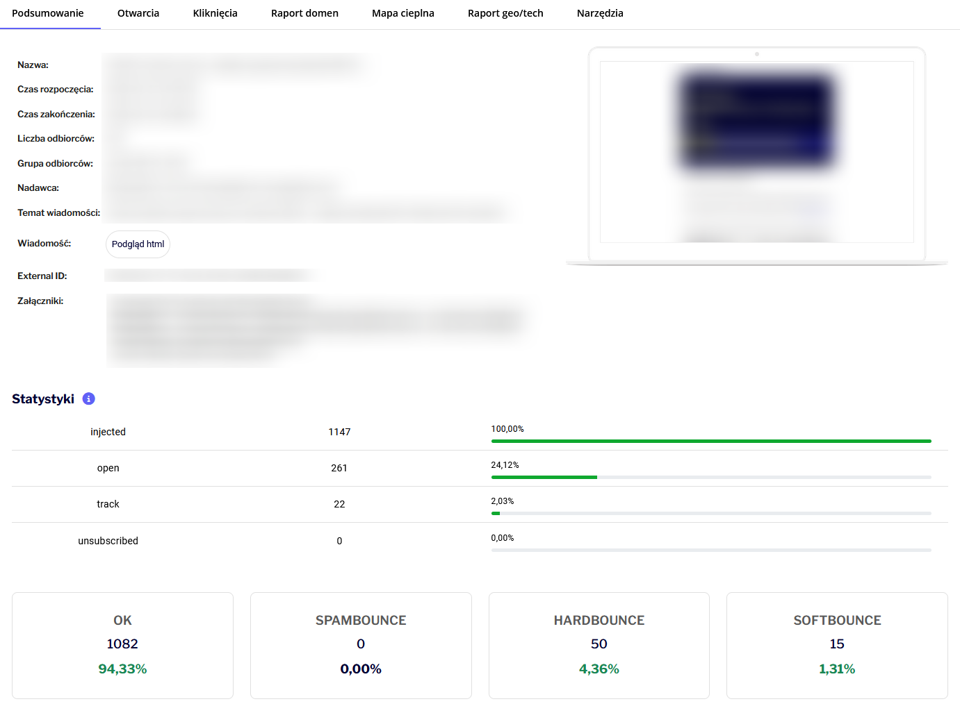 Znajdziesz tutaj wizytówkę swojej kampanii. Oprócz podstawowych danych (nazwa, czas realizacji, grupa docelowa, podgląd HTML) system zaprezentuje Ci kluczowe wskaźniki efektywności: