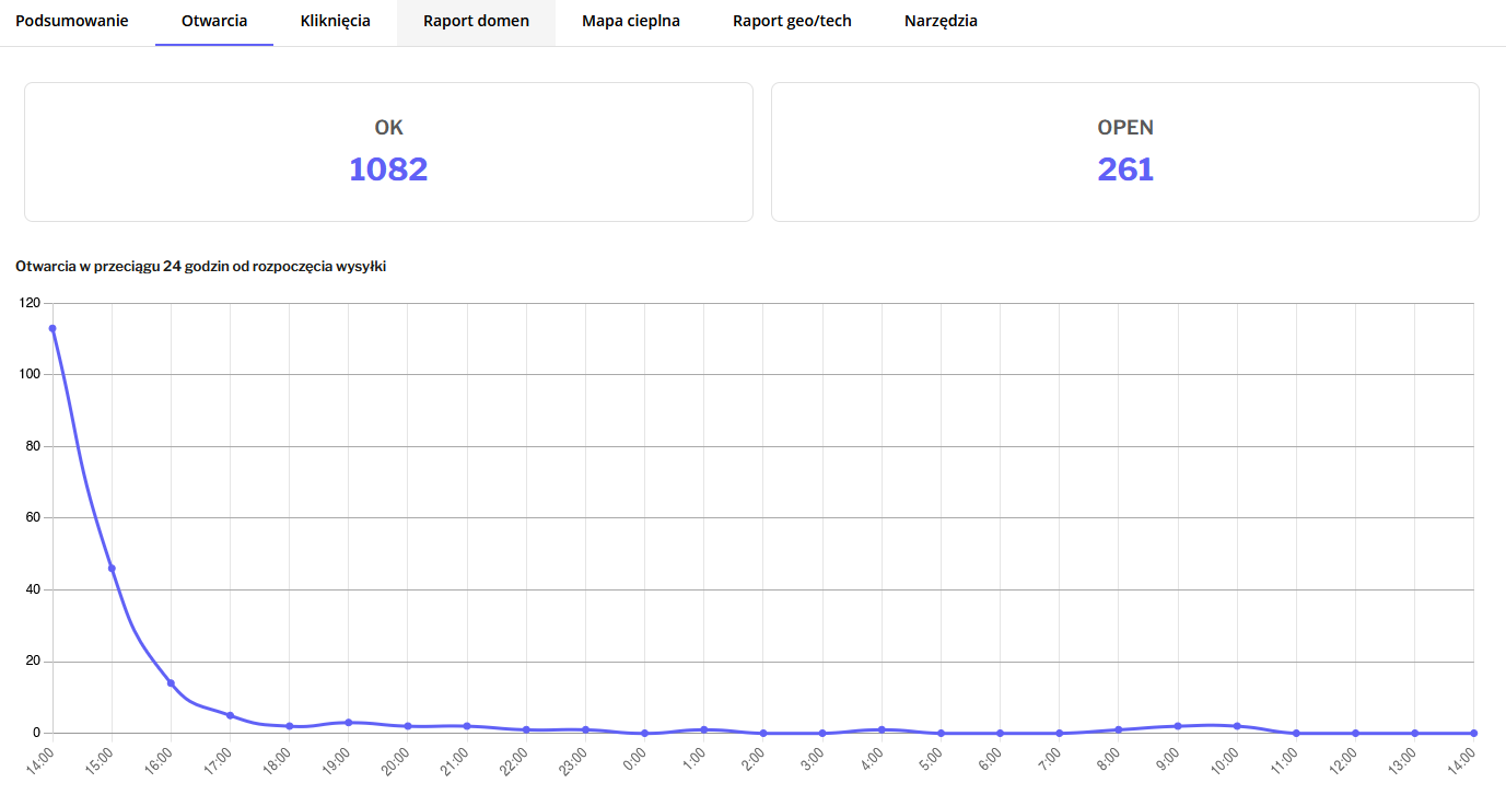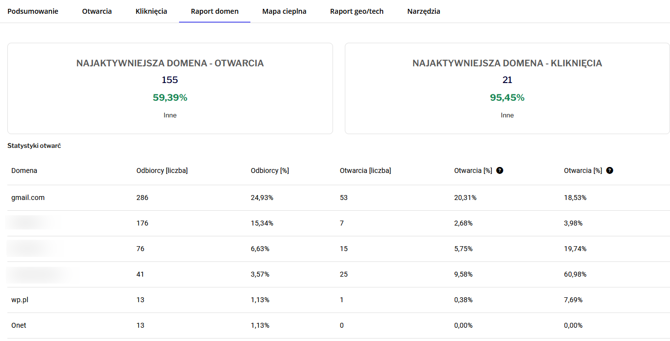 Raport domen: Dowiedz się, u jakich dostawców poczty (na przykład Gmail, Onet, Interia) Twoja kampania radzi sobie najlepiej. Zobaczysz tu zestawienie domen generujących najwięcej otwarć i kliknięć.