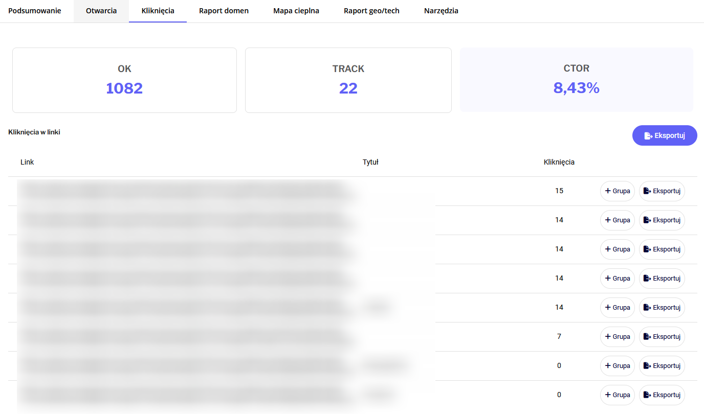 Dwie osobne sekcje, które wizualizują zaangażowanie Twojej bazy w czasie. Sprawdzisz w nich wykresy liniowe pokazujące dynamikę otwarć i kliknięć w dwóch wymiarach: przez pierwsze 24 godziny od wysyłki oraz przez pierwsze 7 dni. W zakładce "Kliknięcia" możesz dodatkowo wyeksportować pełne dane do pliku Excel lub błyskawicznie utworzyć nową grupę z odbiorców, którzy kliknęli w konkretny link.