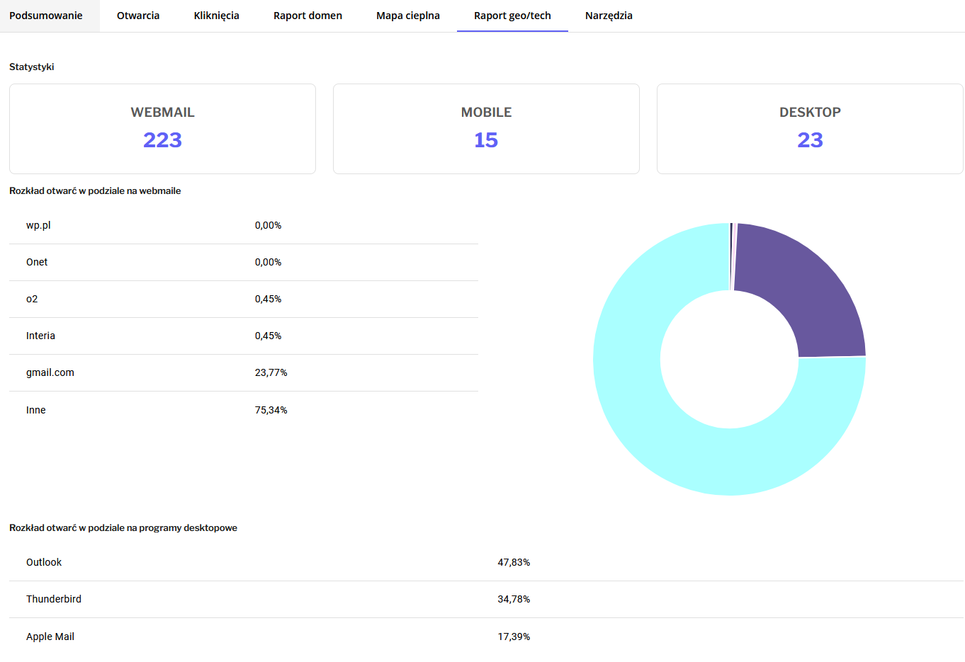 Raport geo/tech: Poznaj preferencje sprzętowe swojej bazy. Sprawdzisz tu statystyki otwarć z podziałem na środowiska (Webmail, Mobile, Desktop) oraz przybliżone lokalizacje (Miasta i Kraje).