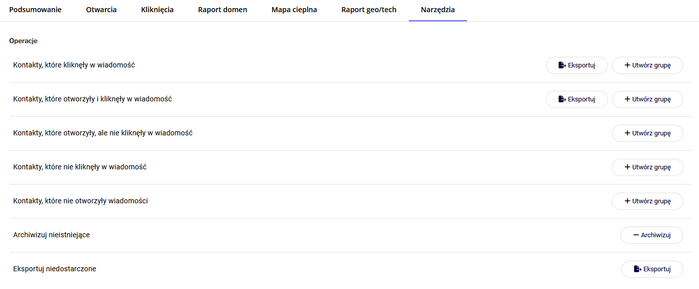 Zakładka "Narzędzia" pozwala Ci na zaawansowane zarządzanie listą kontaktów. Wyeksportujesz stąd adresy niedostarczone (wraz z przyczynami błędu) oraz stworzysz nowe segmenty statyczne (na przykład grupę osób, które nie otworzyły konkretnej wiadomości).